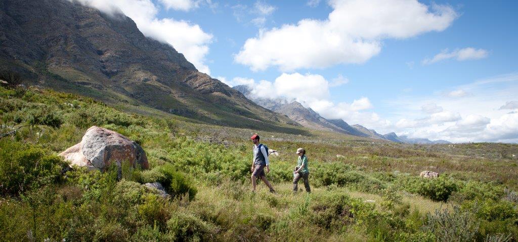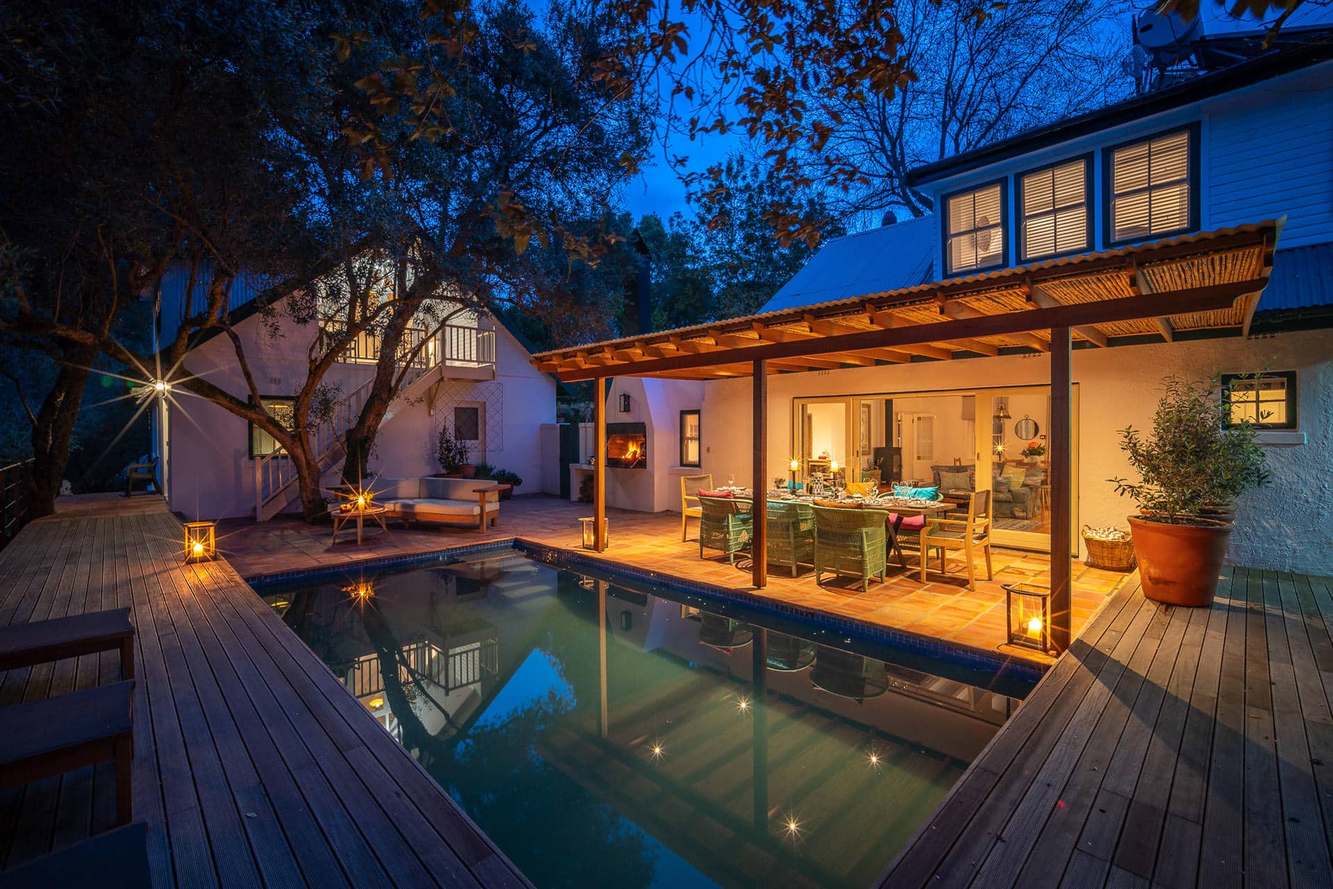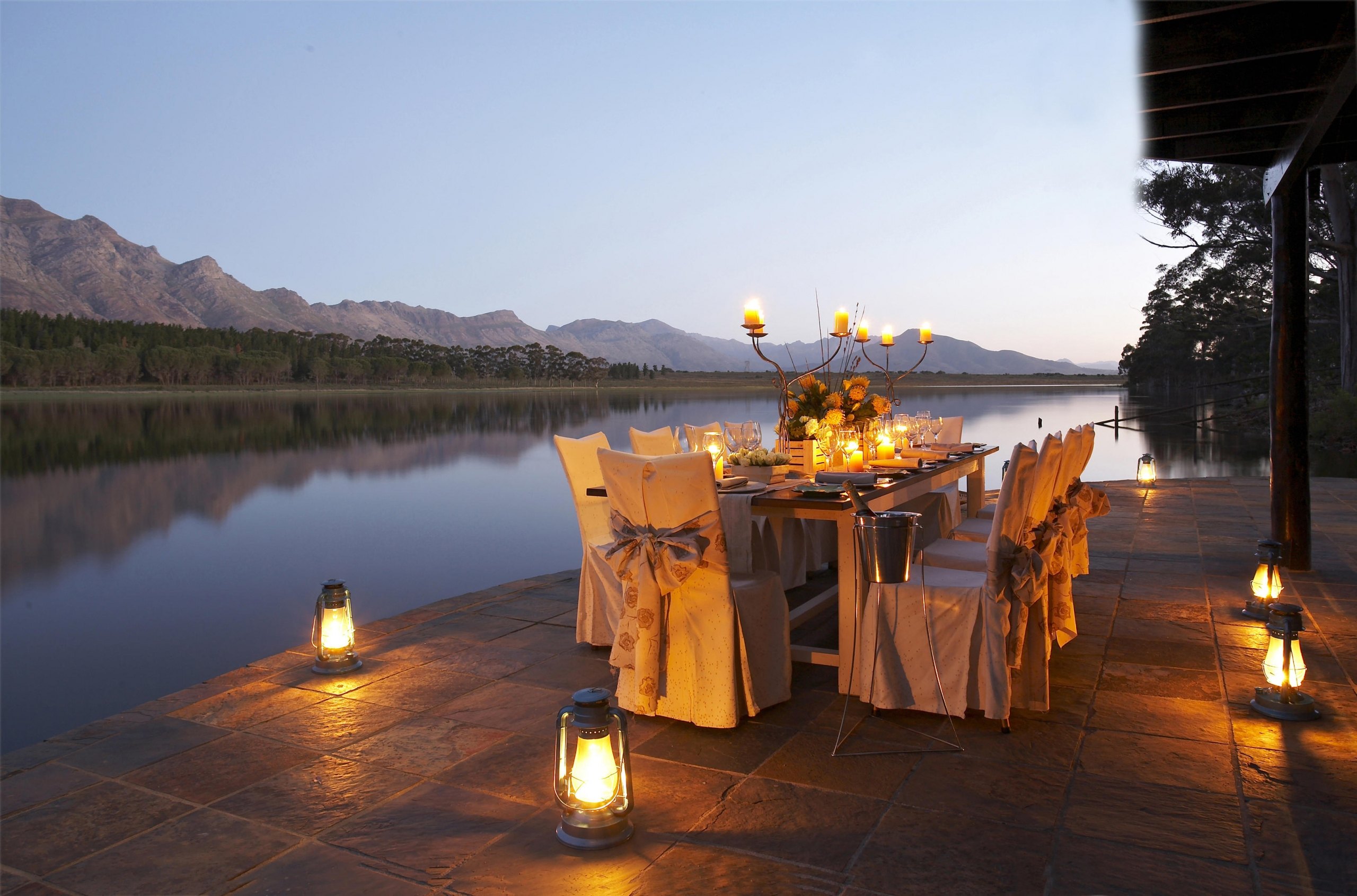Bartholomeus Klip is situated in the Western Cape just over an hour from Cape Town. It is a beautifully restored Edwardian farmhouse that has 5 large en-suite bedrooms. There is a separate house called Wild Olive that sleeps a further 7 guests, has its own small pool, and is ideal for families who want exclusivity. The main homestead at Bartholomeus Klip is over a hundred years old but is filled with modern comforts, including air-conditioning for the hot days of summer. It is surrounded by a wide shady veranda, with areas of comfortable seating overlooking the gardens, and the house itself is furnished with antiques and designer fabrics.This small country house luxury hotel makes sure you have the feeling of being a guest in a particularly charming and hospitable home, where you are always welcome. Surrounding the farmhouse is a 4000 hectare private nature reserve which is pure fynbos. Nature drives go out morning and afternoon or guests can explore the reserve on mountain bikes or by foot. The reserve is home to African wildlife such as zebra, eland, springbok, bontebok, wildebeest, even buffalo, but also wonderful spring flowers and bird life. Quite the most spectacular feature however is a huge lake at the bottom of the garden on the banks of which Bartholomeus Klip have built an elegant deck house. The views of the sun setting against the looming Elandskloof mountains is breathtaking.