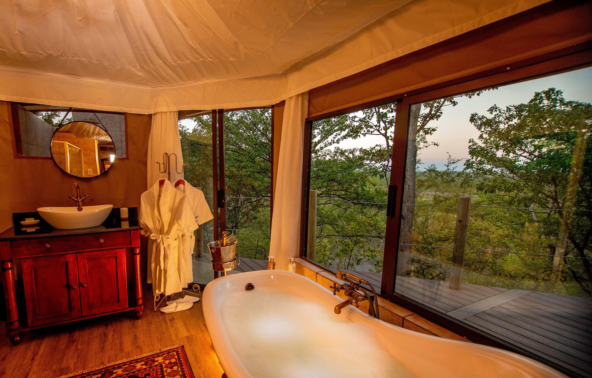 The spacious luxury safari tents of Victoria Falls River Lodge are nestled on the banks of the mighty Zambezi, with an open plan design that has been positioned just back from the river – in view of the elephants’ natural evening route.