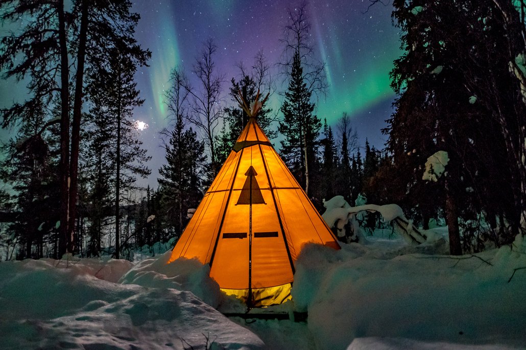 Transfer to Sápmi Nature Camp, where you’ll spend the night in a heated tipi in a forest full of wild reindeer. Learn about Sámi culture by meeting with reindeer herders, many whose families have been involved in herding for generations and the fight to ensure Swedish Lapland remains untouched. Live like a local by spending the evening gathered around the campfire with Sámi hosts. Be sure to fill up your water bottle from the water hole in the ice for the freshest water you’ve ever tasted.